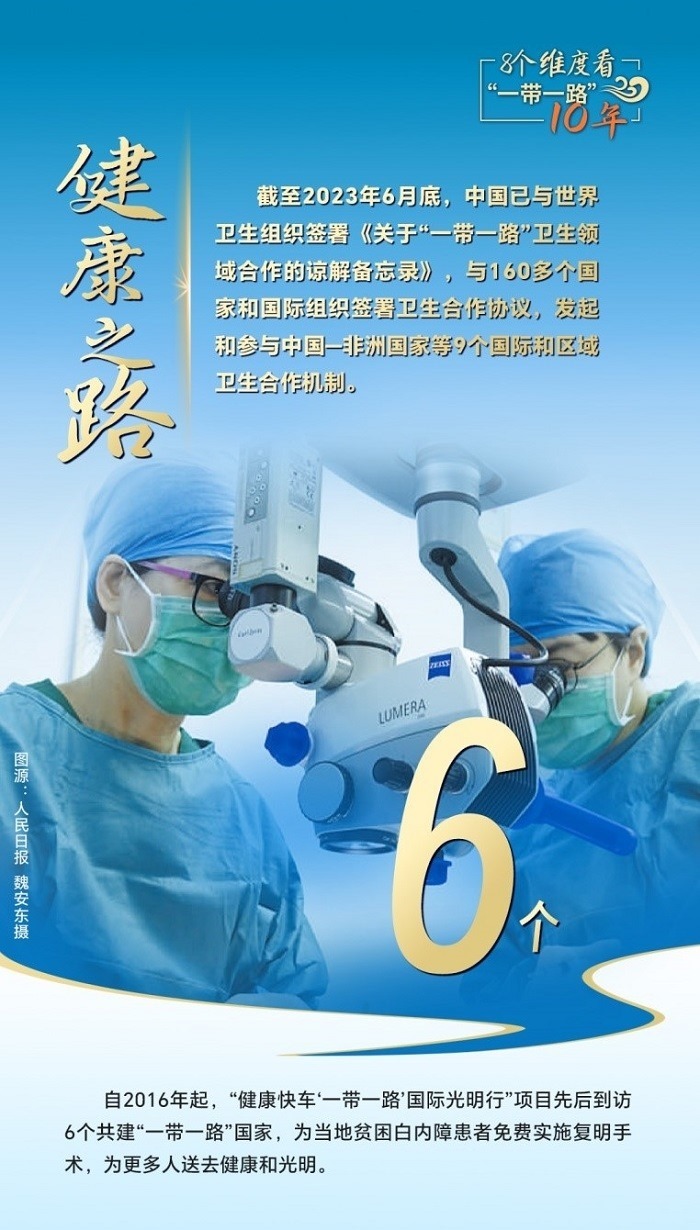 截至2023年6月底,中國(guó)已與世界衛(wèi)生組織簽署《關(guān)于“一帶一路”衛(wèi)生領(lǐng)域合作的諒解備忘錄》,與160多個(gè)國(guó)家和國(guó)際組織簽署衛(wèi)生合作協(xié)議,發(fā)起和參與中國(guó)—非洲國(guó)家、中國(guó)—阿拉伯國(guó)家、中國(guó)—東盟衛(wèi)生合作等9個(gè)國(guó)際和區(qū)域衛(wèi)生合作機(jī)制。為共建國(guó)家培養(yǎng)數(shù)萬名衛(wèi)生管理、公共衛(wèi)生、醫(yī)學(xué)科研等專業(yè)人才,向58個(gè)國(guó)家派出中國(guó)醫(yī)療隊(duì),赴30多個(gè)國(guó)家開展“光明行”,免費(fèi)治療白內(nèi)障患者近萬名,與湄公河流域國(guó)家、中亞國(guó)家、蒙古國(guó)等周邊國(guó)家開展跨境醫(yī)療合作,衛(wèi)生健康合作成效顯著。