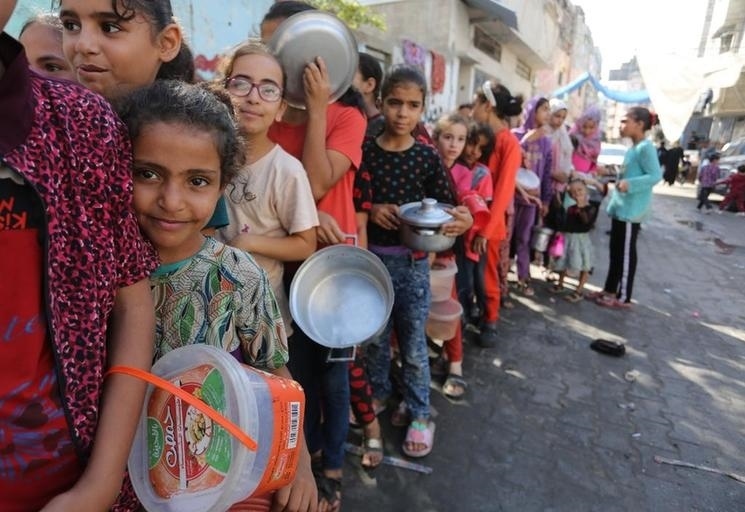 11月9日,在加沙地帶南部城市拉法,人們在一個臨時分發(fā)點排隊領取食物。新華社發(fā)(哈立德·奧馬爾攝)
