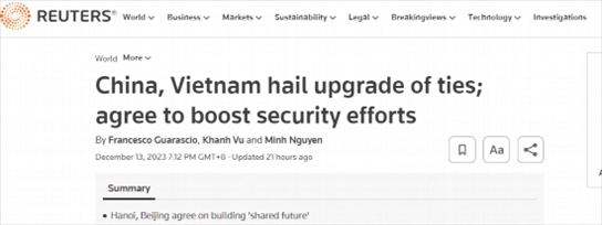 中國日報(bào)網(wǎng)12月14日電 12月12日,中國和越南共同宣布中越兩黨兩國關(guān)系新定位,在深化中越全面戰(zhàn)略合作伙伴關(guān)系基礎(chǔ)上,攜手構(gòu)建具有戰(zhàn)略意義的中越命運(yùn)共同體。國際媒體對中越關(guān)系新定位進(jìn)行了密集報(bào)道,認(rèn)為雙邊關(guān)系更加重要,中越兩黨兩國關(guān)系邁上新臺階。