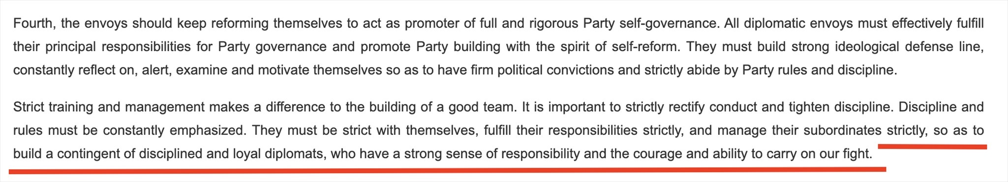 “鐵軍”一詞常見于政府文件或領(lǐng)導(dǎo)人講話,更多的是強(qiáng)調(diào)工作作風(fēng)和紀(jì)律。在近年來(lái)中國(guó)領(lǐng)導(dǎo)人講話中,曾多次出現(xiàn)“紀(jì)律監(jiān)察鐵軍”“生態(tài)環(huán)境保護(hù)鐵軍”等表述。中國(guó)領(lǐng)導(dǎo)人在接見與會(huì)使節(jié)時(shí)的講話中說:“打造一支對(duì)黨忠誠(chéng)、勇于擔(dān)當(dāng)、敢斗善斗、紀(jì)律嚴(yán)明的外交鐵軍?!蓖饨徊烤W(wǎng)站對(duì)這句話的英文翻譯(見下圖)同樣強(qiáng)調(diào)外交隊(duì)伍的紀(jì)律、責(zé)任和勇氣。作為通行做法,世界各國(guó)對(duì)本國(guó)外交人員都有著很高的紀(jì)律要求。