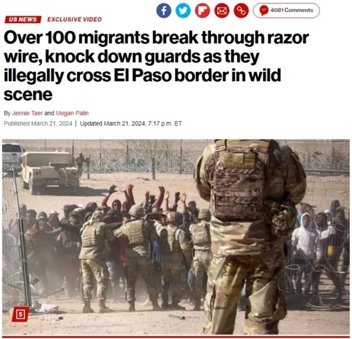 中新網(wǎng)3月22日電 綜合外媒報(bào)道,當(dāng)?shù)貢r(shí)間21日,在得克薩斯州邊境墻附近,有上百名非法移民沖破鐵絲網(wǎng)試圖非法進(jìn)入美國(guó)。他們撞倒得州國(guó)民警衛(wèi)隊(duì)成員,試圖越過(guò)美墨邊境,場(chǎng)面一度十分混亂。