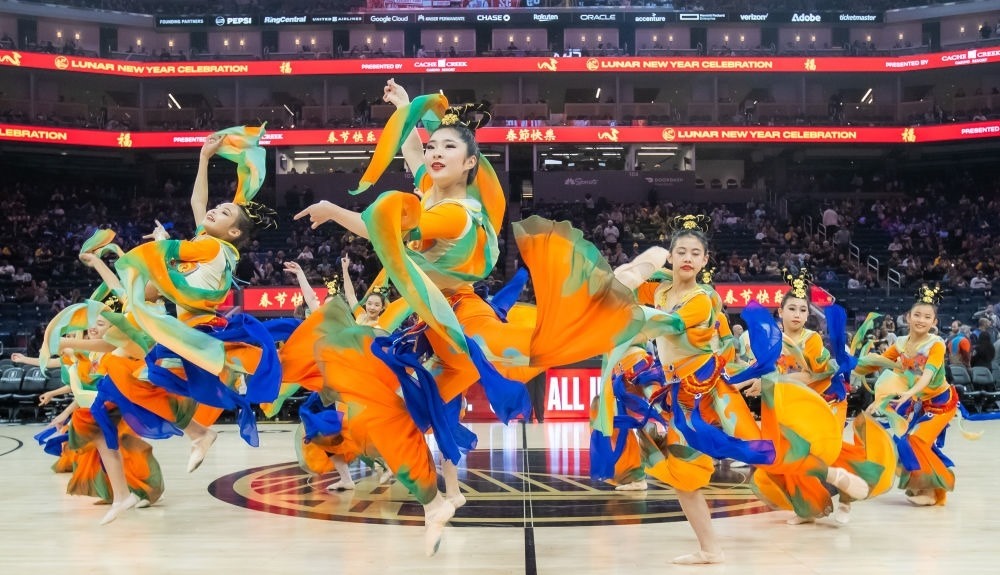 2月14日,舊金山華人藝術(shù)團(tuán)演員在比賽中場為觀眾表演,歡慶中國農(nóng)歷新年。新華社發(fā)(董旭東攝)