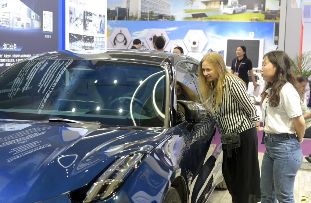 4月15日,采購商在第135屆廣交會上參觀新能源汽車。新華社記者盧漢欣攝