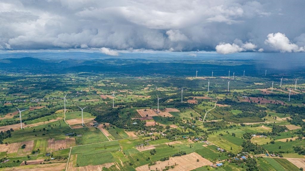 這是2023年10月5日在泰國猜也蓬府拍攝的由中國金風科技提供的風力發(fā)電機(無人機照片)。新華社記者王騰攝
