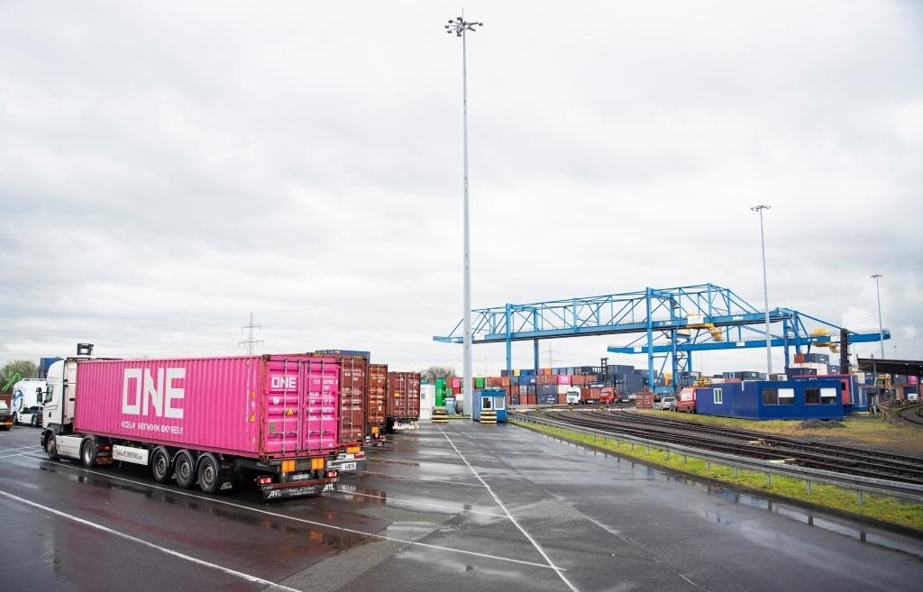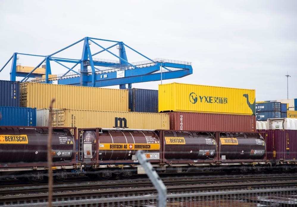 這是3月28日在德國杜伊斯堡一處貨運(yùn)場站拍攝的集裝箱。