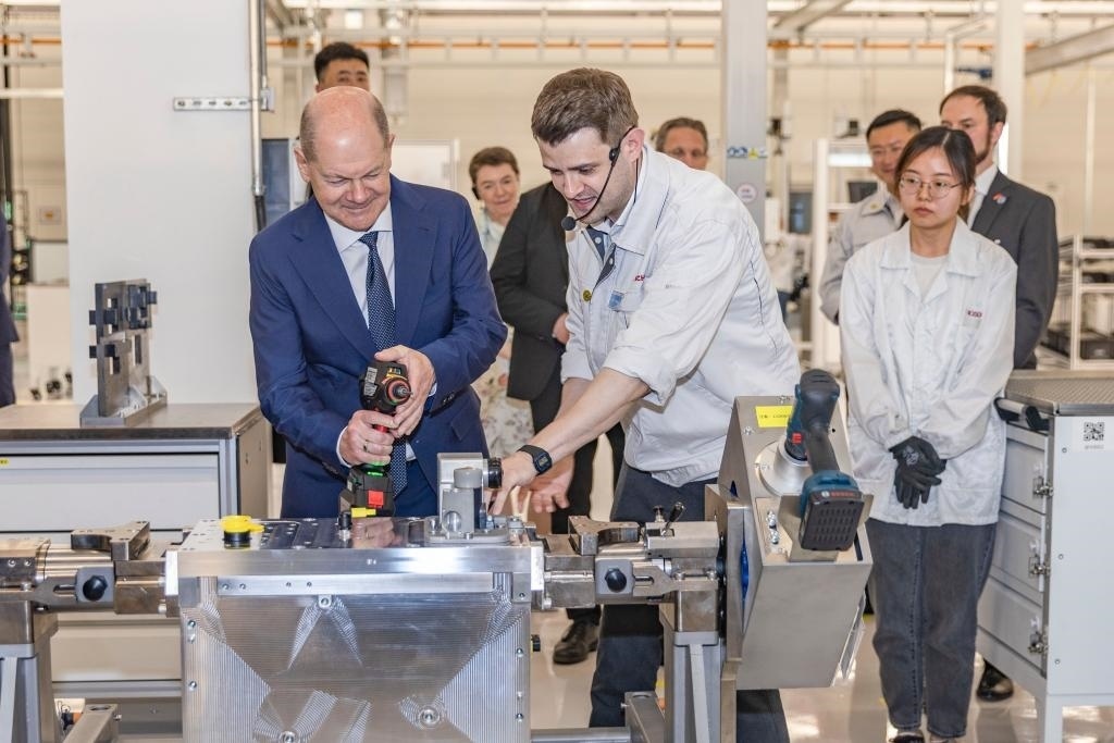 4月14日,德國總理朔爾茨在位于重慶市九龍坡區(qū)的博世氫動力系統(tǒng)(重慶)有限公司參訪。