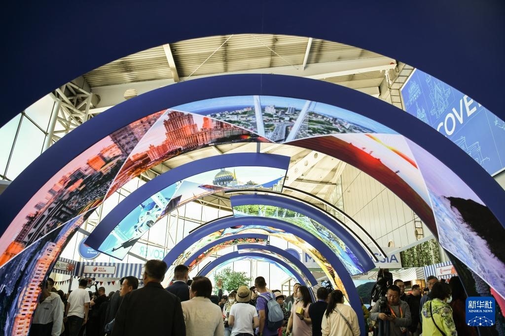 5月18日,參會者走進在哈爾濱國際會展中心舉行的第八屆中俄博覽會展館。