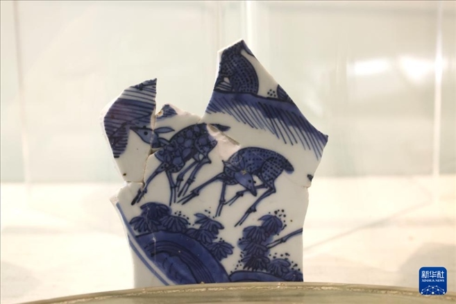 這是5月26日在位于巴林麥納麥的巴林國家博物館拍攝的中國青花瓷碎片。 新華社記者 王海洲 攝