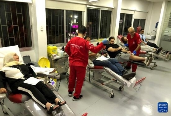 9月17日,在黎巴嫩貝魯特,人們?yōu)閭骱粼O(shè)備爆炸事件傷者獻(xiàn)血。新華社發(fā)(比拉爾·賈維希攝)