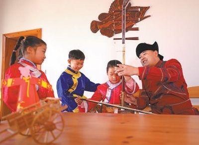 哈拉新村村民在教當?shù)睾⒆友葑鄠鹘y(tǒng)樂器。齊齊哈爾大學(xué)孟加拉國籍留學(xué)生 衣睿實攝“在哈拉新村,我看到四弦琴造型的村口大門、魚叉狀的路燈,還有整整齊齊的‘介字房’……這里獨特的民族文化、濃郁的鄉(xiāng)土風情,給我留下了深刻印象。當?shù)丶缺A魝鹘y(tǒng)的達斡爾族人文特征,又開發(fā)文化體驗館、民族特色美食等現(xiàn)代旅游資源,重視文化保護和傳承的做法值得借鑒。”