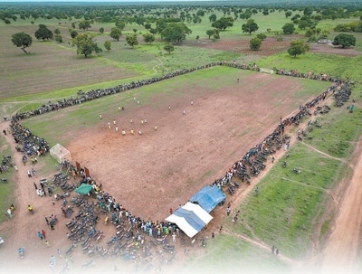 由中國援貝寧棉花技術(shù)援助項(xiàng)目組修建的足球場(chǎng)(無人機(jī)照片)。新華社記者 李亞輝攝
