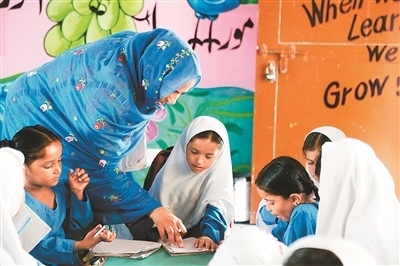 走進干凈整潔的校園,讀書聲、嬉戲聲聲聲入耳,孩童的活力、青春氣息撲面而來。在八年級的課室里,戴著一條寫有“文學(xué)比賽冠軍”紅綬帶的女學(xué)生薩伊巴·阿斯加爾·阿里成功搶到了回答問題的機會,正在大聲地在全班面前朗誦英語課文。薩伊巴告訴記者,她有7個姐妹,如果沒有這所學(xué)校,她可能就沒學(xué)上了。