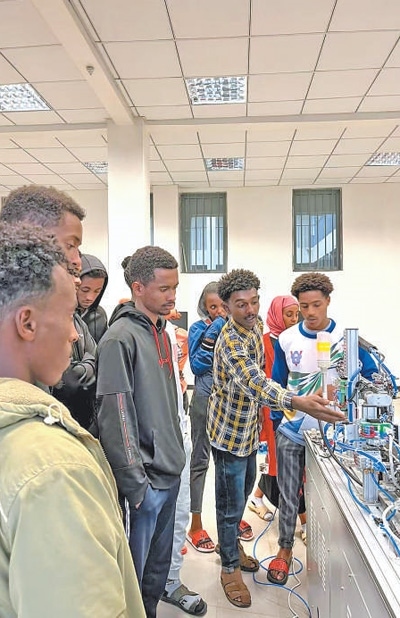 埃塞俄比亞魯班工坊當?shù)亟處煘閷W(xué)生們講解機電一體化設(shè)備的操作方法。