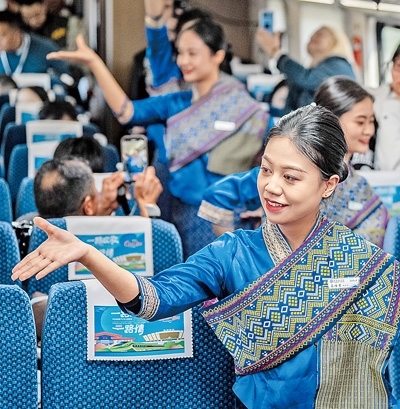 1月14日,中國(guó)鐵路昆明局集團(tuán)有限公司“金花列車員”在D87次中老鐵路國(guó)際旅客列車上表演節(jié)目。