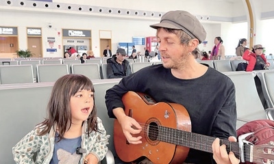 西雙版納站,喬納森和孩子在候車時(shí)一起彈唱。