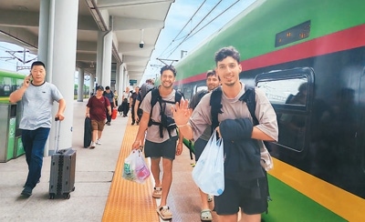 外國旅客乘坐中老鐵路跨境旅客列車抵達云南磨憨站。