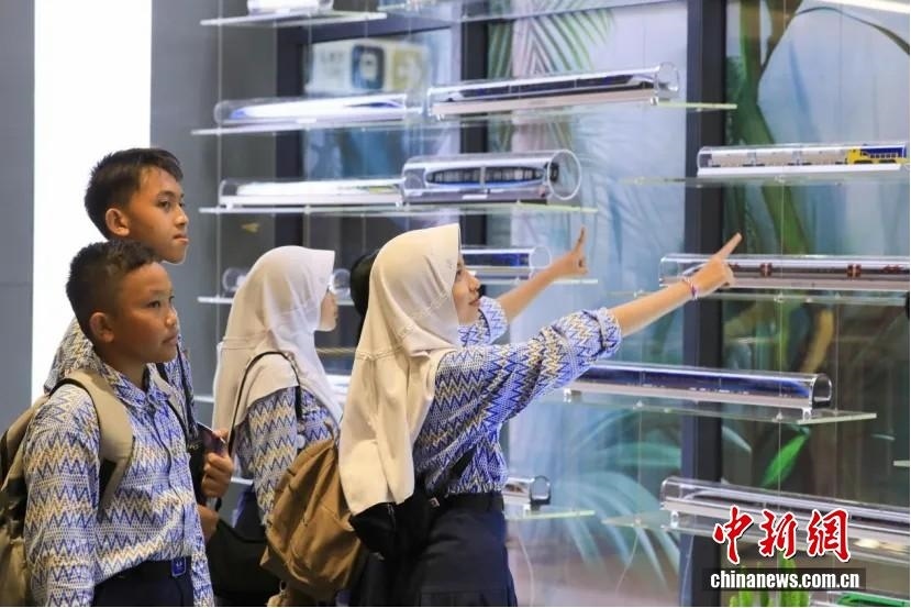 當(dāng)?shù)貢r間2024年10月17日,一群印尼學(xué)生在印尼雅加達的雅萬高鐵動車組科普文化交流基地參觀。 中新社記者 李志全 攝