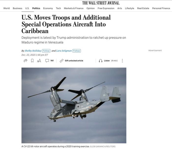 據(jù)美國(guó)官員透露,至少10架由特戰(zhàn)部隊(duì)使用的CV-22型“魚鷹”傾轉(zhuǎn)旋翼機(jī)22日晚從美國(guó)新墨西哥州坎農(nóng)空軍基地飛抵加勒比地區(qū)。