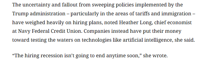 報道還援引美國海軍聯(lián)邦信用合作社(Navy Federal Credit Union)首席經(jīng)濟(jì)學(xué)家希瑟·朗的觀點稱,特朗普政府推行的一系列政策,尤其是關(guān)稅和移民政策,所帶來的不確定性及后果對招聘計劃造成了沉重影響。希瑟·朗認(rèn)為,招聘市場的低迷狀況短期內(nèi)不會結(jié)束。