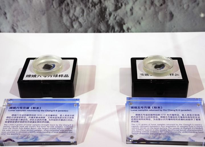 2025年11月5日在第八屆進(jìn)博會(huì)國家展中國館拍攝的“嫦娥五號(hào)”月壤和“嫦娥六號(hào)”月壤。新華社記者 劉穎 攝