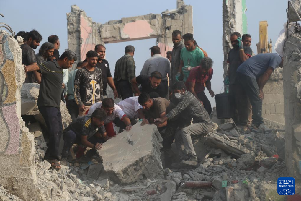 2月28日,在伊朗米納卜市一所被襲擊的小學(xué),救援人員和當(dāng)?shù)鼐用裨噲D從廢墟里營(yíng)救傷員。