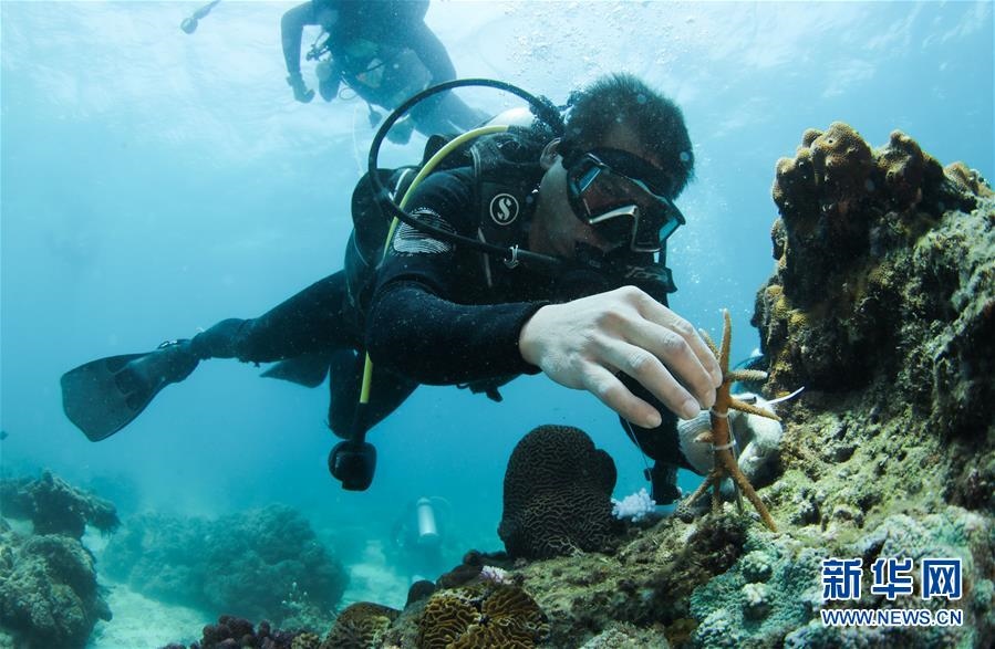 在海南三亞蜈支洲島海域,中科院南海海洋研究所副研究員張?jiān)£枅F(tuán)隊(duì)工作人員在海底的移植釘上固定珊瑚(4月28日攝)。新華社記者楊冠宇攝