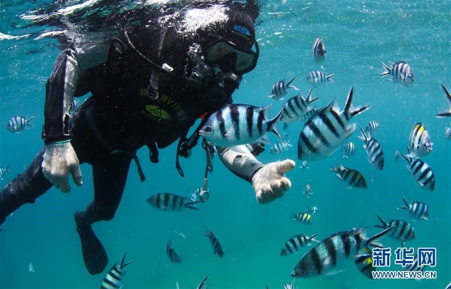 在海南三亞蜈支洲島海域,旅游區(qū)工作人員即將下潛到海洋牧場(chǎng)進(jìn)行作業(yè)(4月27日攝)。新華社記者楊冠宇攝