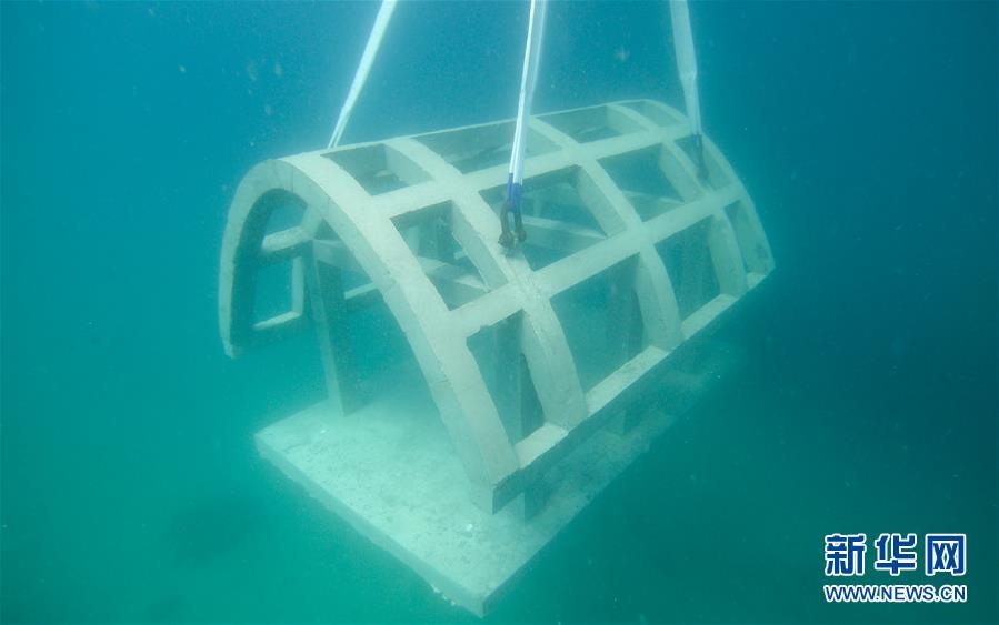 在海南三亞蜈支洲島海域,旅游區(qū)工作人員將船型屋魚礁吊裝入海(2016年1月21日攝)。新華社發(fā)