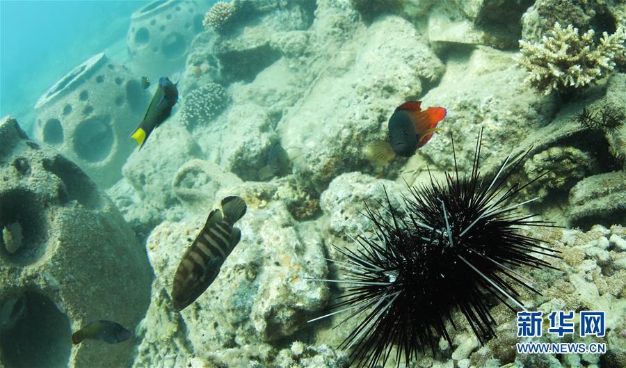 在海南三亞蜈支洲島海域,魚兒在海洋牧場(chǎng)的人工魚礁附近覓食(3月28日攝)。新華社記者楊冠宇攝