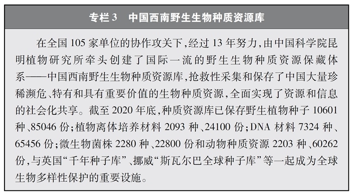 加快重要生物遺傳資源收集保存和利用。中國高度重視生物資源保護(hù),近年來在生物資源調(diào)查、收集、保存等方面取得較大進(jìn)展。實(shí)施戰(zhàn)略生物資源計劃專項(xiàng),完善生物資源收集收藏平臺,建立種質(zhì)資源創(chuàng)新平臺、遺傳資源衍生庫和天然化合物轉(zhuǎn)化平臺,持續(xù)加強(qiáng)野生生物資源保護(hù)和利用。實(shí)施一批種質(zhì)資源保護(hù)和育種創(chuàng)新項(xiàng)目,截至2020年底,形成了以國家作物種質(zhì)長期庫及其復(fù)份庫為核心、10座中期庫與43個種質(zhì)圃為支撐的國家作物種質(zhì)資源保護(hù)體系,建立了199個國家級畜禽遺傳資源保種場(區(qū)、庫),為90%以上的國家級畜禽遺傳資源保護(hù)名錄品種建立了國家級保種單位,長期保存作物種質(zhì)資源52萬余份、畜禽遺傳資源96萬份。建設(shè)99個國家級林木種質(zhì)資源保存庫,以及新疆、山東2個國家級林草種質(zhì)資源設(shè)施保存庫國家分庫,保存林木種質(zhì)資源4.7萬份。建設(shè)31個藥用植物種質(zhì)資源保存圃和2個種質(zhì)資源庫,保存種子種苗1.2萬多份。