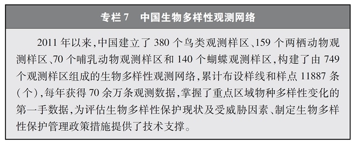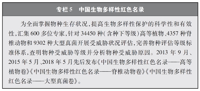 開展全國生物多樣性調(diào)查與評估。大力推進(jìn)生物多樣性保護(hù)重大工程實(shí)施,結(jié)合自然資源調(diào)查、生態(tài)系統(tǒng)監(jiān)測評估等工作,不斷完善生物多樣性調(diào)查與評估能力,首次將生物多樣性指標(biāo)納入生態(tài)質(zhì)量綜合評價指標(biāo)體系,引導(dǎo)地方加強(qiáng)生態(tài)文明建設(shè)與生物多樣性保護(hù)。開展自然資源調(diào)查,包括森林、草原、水、濕地、荒漠、海洋等,建立自然資源調(diào)查評價監(jiān)測制度。構(gòu)建了涵蓋2376個縣級行政單元、樣線總長超過3.4萬公里的物種分布數(shù)據(jù)庫,建立物種資源調(diào)查及收集信息平臺,準(zhǔn)確反映野生動植物空間分布狀況。完成長江經(jīng)濟(jì)帶、京津冀等國家戰(zhàn)略區(qū)域180多個縣級行政區(qū)生物多樣性調(diào)查與評估。組織開展近海漁業(yè)資源調(diào)查,初步掌握近海漁業(yè)資源狀況。陸續(xù)發(fā)布《中國植物紅皮書》《中國瀕危動物紅皮書》《中國物種紅色名錄》《中國生物多樣性紅色名錄》,基本掌握生物多樣性總體情況,為加強(qiáng)生物多樣性保護(hù)奠定了科學(xué)基礎(chǔ)。