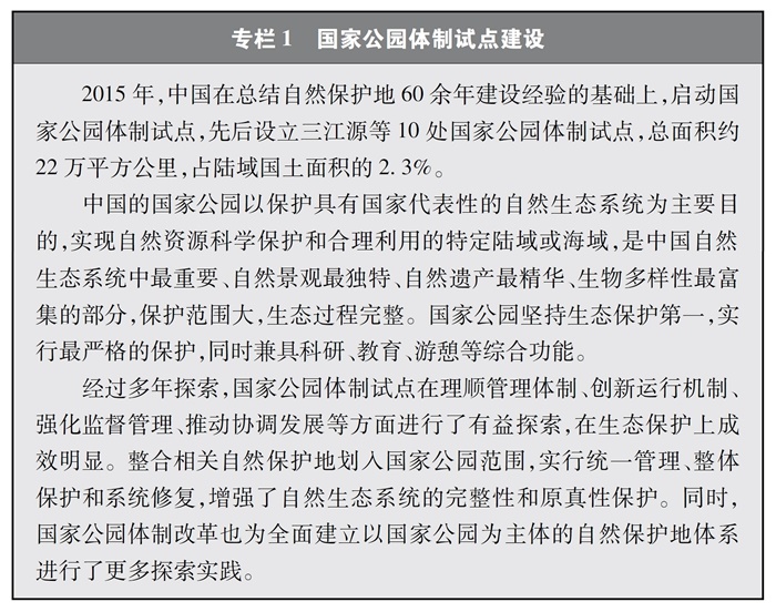 中國不斷推進(jìn)自然保護(hù)地建設(shè),啟動國家公園體制試點(diǎn),構(gòu)建以國家公園為主體的自然保護(hù)地體系,率先在國際上提出和實(shí)施生態(tài)保護(hù)紅線制度,明確了生物多樣性保護(hù)優(yōu)先區(qū)域,保護(hù)了重要自然生態(tài)系統(tǒng)和生物資源,在維護(hù)重要物種棲息地方面發(fā)揮了積極作用。