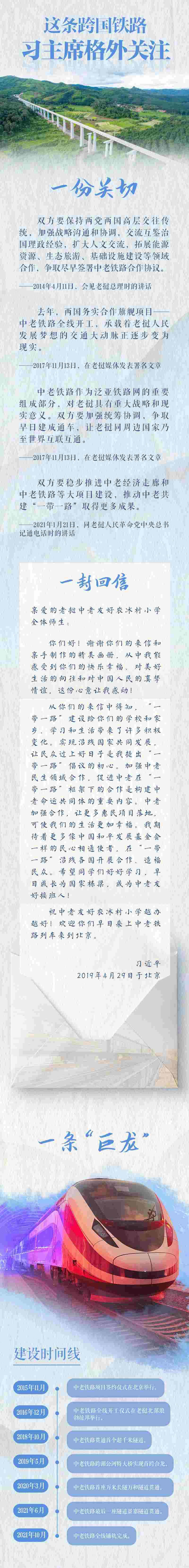 中老鐵路北起中國昆明,南至老撾萬象,全長1000多公里。這條承載著友誼、科技、綠色、開放的跨國鐵路,是我國“一帶一路”倡議與老撾“變陸鎖國為陸聯(lián)國”戰(zhàn)略對接的重要項(xiàng)目,也是“一帶一路”倡議提出以后,首條以中方為主投資建設(shè)、全線采用中國技術(shù)標(biāo)準(zhǔn)、使用中國設(shè)備并與中國鐵路網(wǎng)直接聯(lián)通的跨國鐵路。對于這條鐵路,習(xí)近平主席一直格外關(guān)注。他與老撾高層多次就中老鐵路建設(shè)進(jìn)行深入溝通,并給老撾萬象中老友好農(nóng)冰村小學(xué)師生回信,歡迎他們早日乘上中老鐵路列車來到北京。