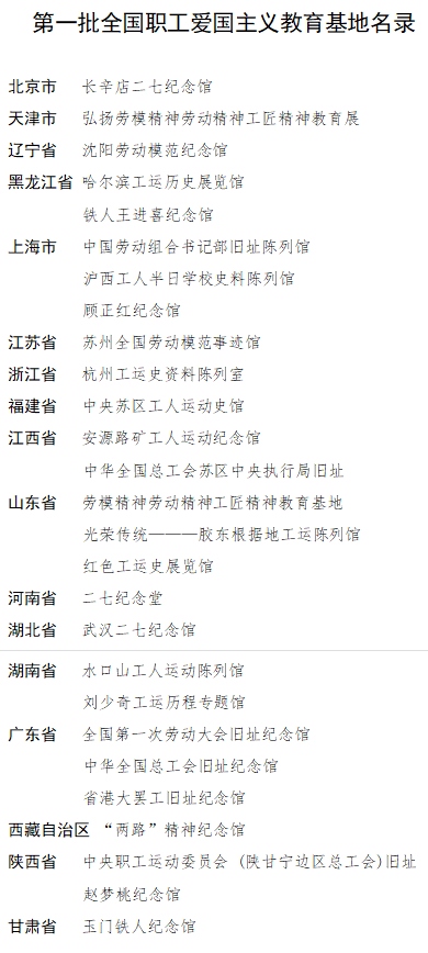 第一批全國(guó)職工愛國(guó)主義教育基地包括北京市長(zhǎng)辛店二七紀(jì)念館、黑龍江省鐵人王進(jìn)喜紀(jì)念館、上海市中國(guó)勞動(dòng)組合書記部舊址陳列館、廣東省全國(guó)第一次勞動(dòng)大會(huì)舊址紀(jì)念館、陜西省中央職工運(yùn)動(dòng)委員會(huì)(陜甘寧邊區(qū)總工會(huì))舊址等27家單位。旨在進(jìn)一步加強(qiáng)紅色工運(yùn)資源的保護(hù)挖掘和宣傳利用,引領(lǐng)各級(jí)工會(huì)努力把紅色工運(yùn)資源建設(shè)成為開展黨史學(xué)習(xí)教育的重要陣地,打造成愛國(guó)主義教育、革命傳統(tǒng)教育、加強(qiáng)職工思想政治引領(lǐng)的生動(dòng)課堂,團(tuán)結(jié)引導(dǎo)廣大職工群眾更好傳承紅色基因、賡續(xù)紅色血脈、汲取奮進(jìn)力量。第一批全國(guó)職工愛國(guó)主義教育基地在中國(guó)工運(yùn)史上影響重大,代表性強(qiáng)、知名度高,現(xiàn)有的設(shè)施建設(shè)和保護(hù)利用較好,符合時(shí)代要求,具有較強(qiáng)的示范引領(lǐng)作用。