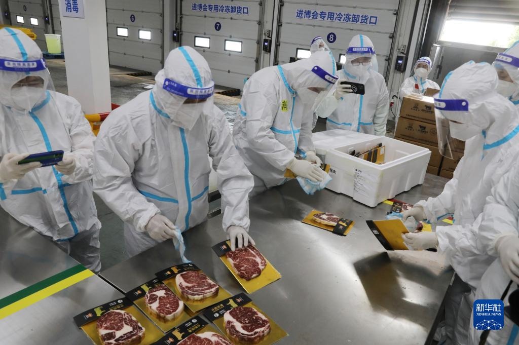 10月20日上午9點(diǎn),第五屆中國(guó)國(guó)際進(jìn)口博覽會(huì)的第一批進(jìn)口冷鏈?zhǔn)称氛蛊繁贿\(yùn)入總倉(cāng)。在接下來(lái)的10天內(nèi),預(yù)計(jì)約100個(gè)全球參展商、3000箱冷鏈?zhǔn)称氛蛊?,將在總倉(cāng)集中完成“最小包裝”消毒和核酸檢測(cè)。