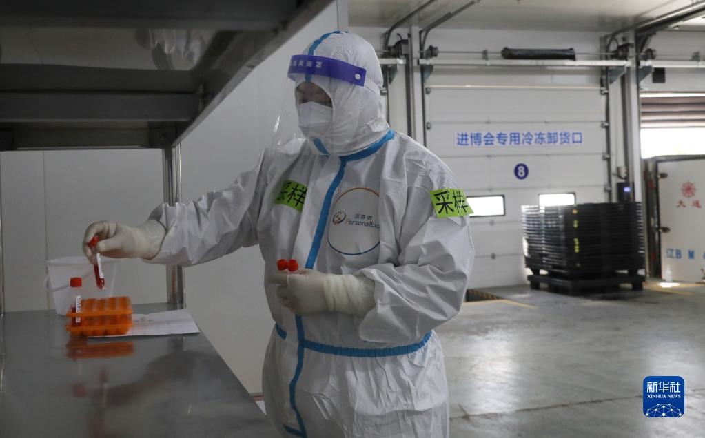 10月20日,一名核酸采樣工作人員在放置入倉(cāng)的冷鏈?zhǔn)称氛蛊泛怂針颖尽P氯A社記者 方喆攝