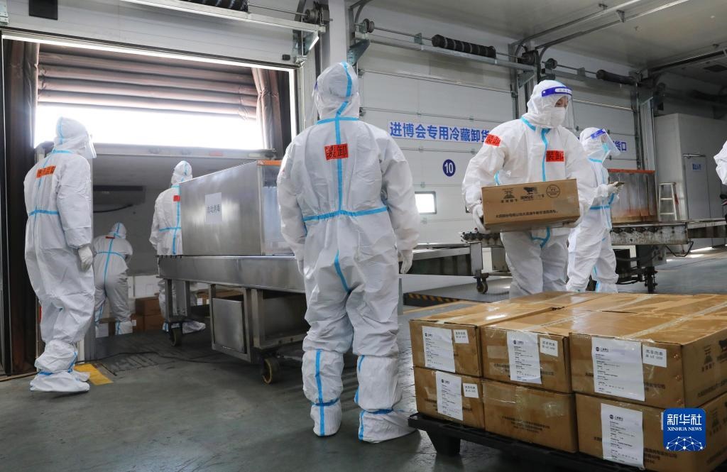 10月20日,工作人員在總倉(cāng)內(nèi)搬運(yùn)完成卸車消毒的冷鏈?zhǔn)称氛蛊?。新華社記者 方喆攝