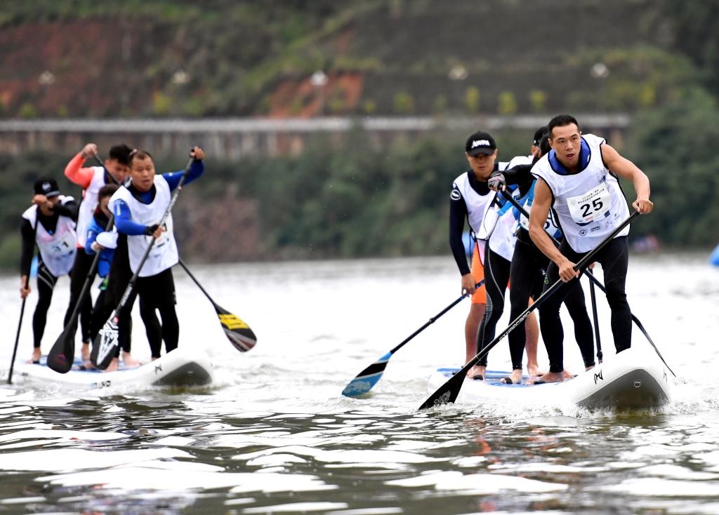 2018年11月18日,參賽選手在槳板團(tuán)體賽決賽中。當(dāng)日,2018年中國(guó)·將樂國(guó)際皮劃艇槳板馬拉松公開賽在福建省將樂縣落幕。新華社記者彭張青攝
