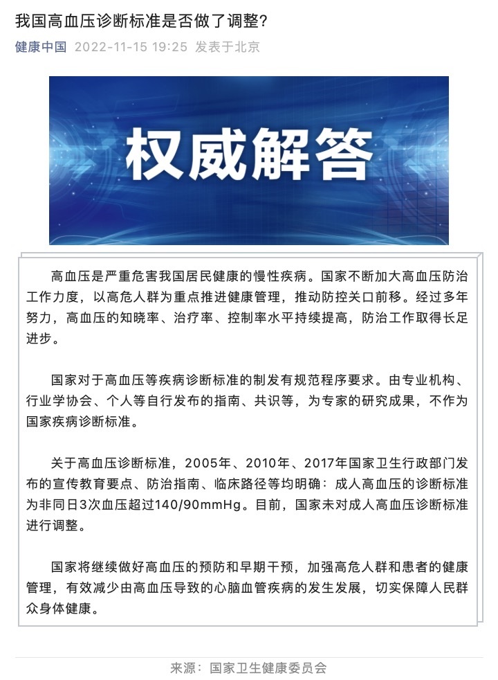 國家衛(wèi)健委:國家未對成人高血壓診斷標準進行調整