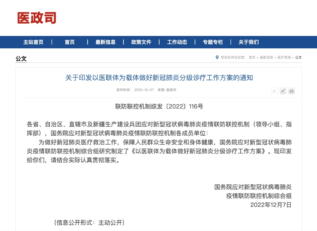 新華社北京12月7日電 為做好新冠肺炎醫(yī)療救治工作,全力保障高齡合并基礎(chǔ)疾病等重癥風(fēng)險較高的感染者及時救治,構(gòu)建更加科學(xué)有序的就醫(yī)秩序,國務(wù)院聯(lián)防聯(lián)控機(jī)制綜合組12月7日發(fā)布《以醫(yī)聯(lián)體為載體做好新冠肺炎分級診療工作方案》。