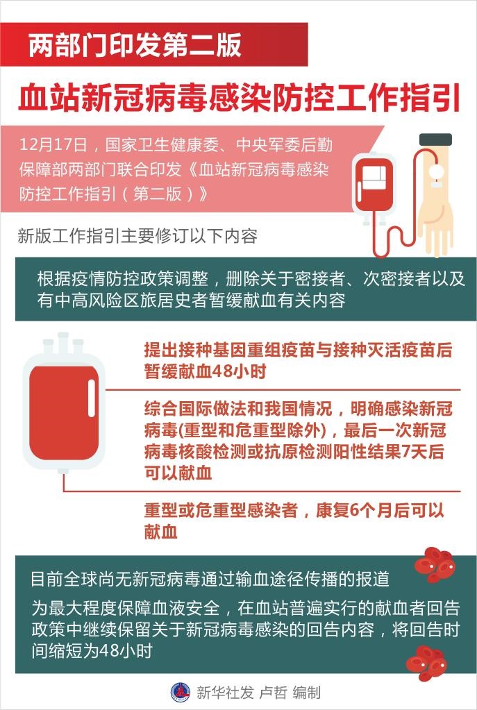 新華社北京12月17日電(記者顧天成、董瑞豐)血站新冠病毒感染防控工作事關(guān)血液安全平穩(wěn)供應(yīng)。17日,國家衛(wèi)生健康委、中央軍委后勤保障部?jī)刹块T聯(lián)合印發(fā)《血站新冠病毒感染防控工作指引(第二版)》,指導(dǎo)采供血機(jī)構(gòu)切實(shí)做好新形勢(shì)下疫情防控工作,保障血站工作人員和獻(xiàn)血者安全,實(shí)現(xiàn)血液安全供應(yīng)。
