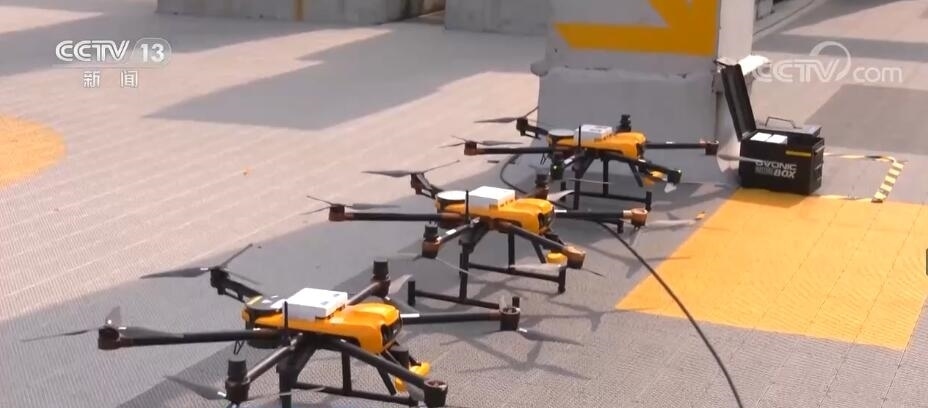 中午11點,在深圳一家商場頂層的平臺上,一架架無人機整齊停放在“停機坪”,工作人員將傳送帶上的外賣掃碼、裝箱,再掛上無人機就準備起飛。在幾公里外的目的地,有智能空投柜等待接收,降落后顧客憑取件碼取餐,方便安全。