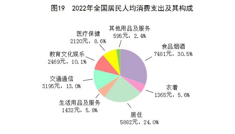 全年全國居民人均消費支出24538元,比上年增長1.8%,扣除價格因素,實際下降0.2%。其中,人均服務性消費支出[54]10590元,比上年下降0.5%,占居民人均消費支出的比重為43.2%。按常住地分,城鎮(zhèn)居民人均消費支出30391元,增長0.3%,扣除價格因素,實際下降1.7%;農(nóng)村居民人均消費支出16632元,增長4.5%,扣除價格因素,實際增長2.5%。全國居民恩格爾系數(shù)為30.5%,其中城鎮(zhèn)為29.5%,農(nóng)村為33.0%。