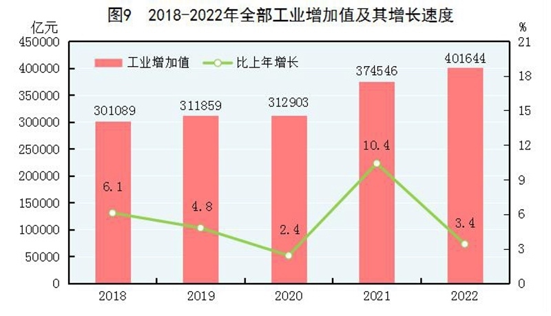 新產(chǎn)業(yè)新業(yè)態(tài)新模式較快成長。全年規(guī)模以上工業(yè)中,高技術制造業(yè)[11]增加值比上年增長7.4%,占規(guī)模以上工業(yè)增加值的比重為15.5%;裝備制造業(yè)[12]增加值增長5.6%,占規(guī)模以上工業(yè)增加值的比重為31.8%。全年規(guī)模以上服務業(yè)[13]中,戰(zhàn)略性新興服務業(yè)[14]企業(yè)營業(yè)收入比上年增長4.8%。全年高技術產(chǎn)業(yè)投資[15]比上年增長18.9%。全年新能源汽車產(chǎn)量700.3萬輛,比上年增長90.5%;太陽能電池(光伏電池)產(chǎn)量3.4億千瓦,增長46.8%。全年電子商務交易額[16]438299億元,按可比口徑計算,比上年增長3.5%。全年網(wǎng)上零售額[17]137853億元,按可比口徑計算,比上年增長4.0%。全年新登記市場主體2908萬戶,日均新登記企業(yè)2.4萬戶,年末市場主體總數(shù)近1.7億戶。