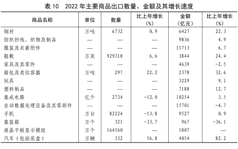 全年貨物進出口總額420678億元,比上年增長7.7%。其中,出口239654億元,增長10.5%;進口181024億元,增長4.3%。貨物進出口順差58630億元,比上年增加15330億元。對“一帶一路”[40]沿線國家進出口總額138339億元,比上年增長19.4%。其中,出口78877億元,增長20.0%;進口59461億元,增長18.7%。對《區(qū)域全面經(jīng)濟伙伴關系協(xié)定》(RCEP)其他成員國[41]進出口額129499億元,比上年增長7.5%。