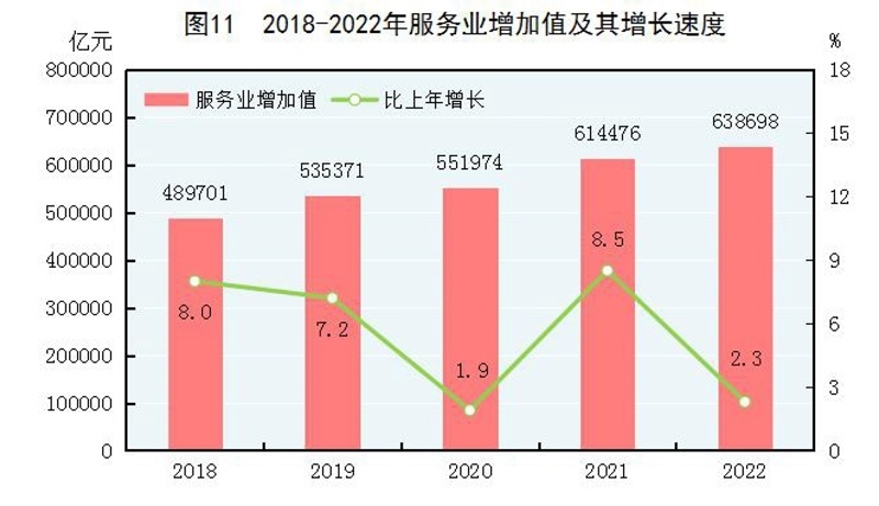 全年批發(fā)和零售業(yè)增加值114518億元,比上年增長0.9%;交通運輸、倉儲和郵政業(yè)增加值49674億元,下降0.8%;住宿和餐飲業(yè)增加值17855億元,下降2.3%;金融業(yè)增加值96811億元,增長5.6%;房地產(chǎn)業(yè)增加值73821億元,下降5.1%;信息傳輸、軟件和信息技術服務業(yè)增加值47934億元,增長9.1%;租賃和商務服務業(yè)增加值39153億元,增長3.4%。全年規(guī)模以上服務業(yè)企業(yè)營業(yè)收入比上年增長2.7%,利潤總額增長8.5%。