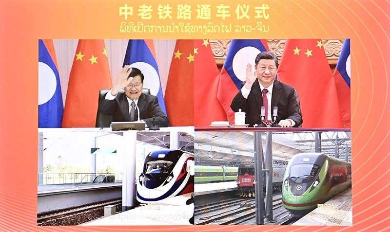 △2021年12月3日,中共中央總書(shū)記、國(guó)家主席習(xí)近平在北京同老撾人民革命黨中央總書(shū)記、國(guó)家主席通倫通過(guò)視頻連線共同出席中老鐵路通車(chē)儀式。