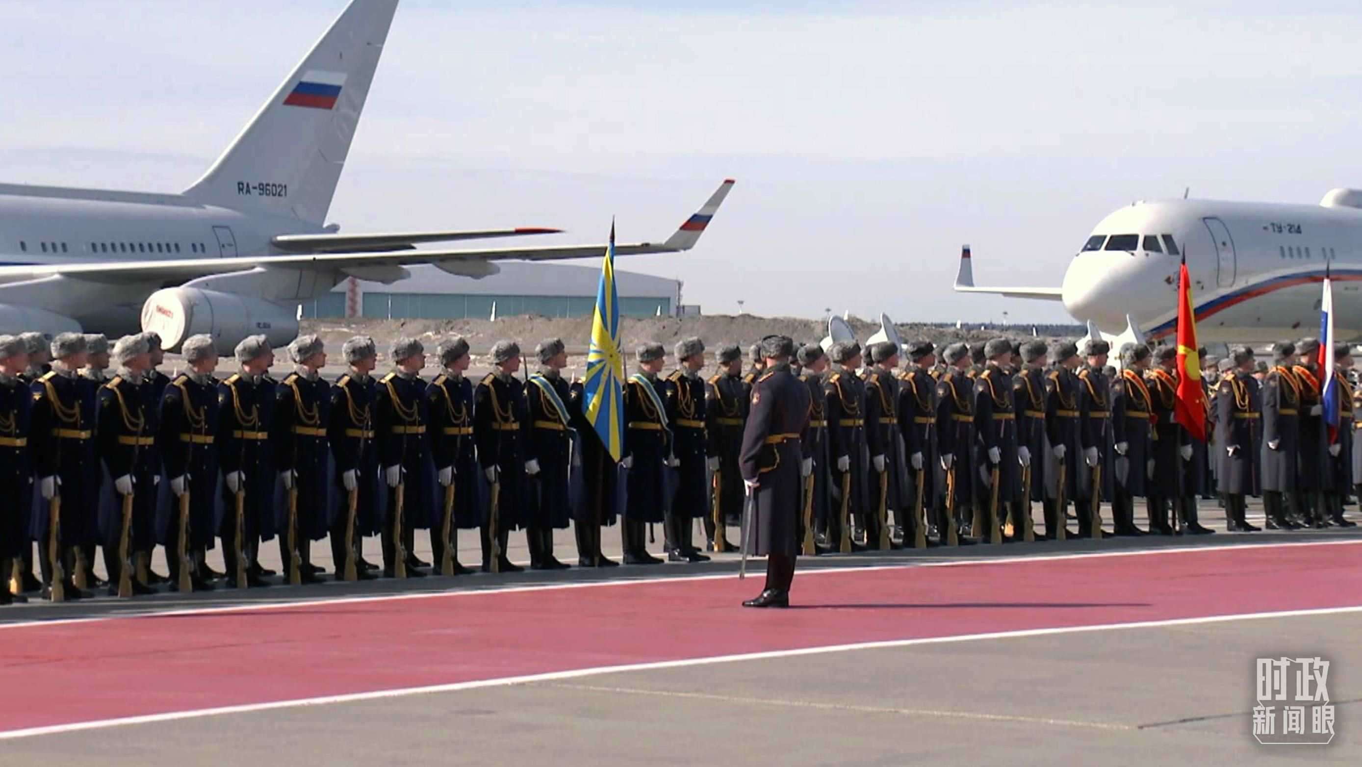 俄方在機場舉行隆重迎賓儀式。軍樂團奏中俄兩國國歌。習(xí)主席檢閱俄羅斯三軍儀仗隊并觀看分列式。