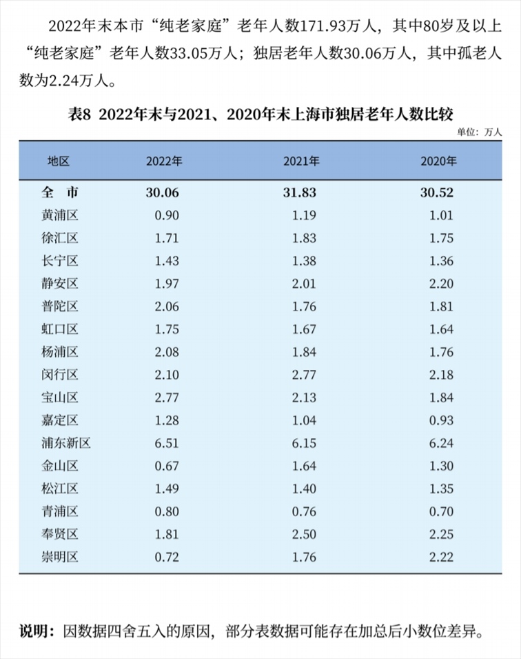 統(tǒng)計(jì)數(shù)據(jù)還顯示,2022年末,上海獨(dú)居老年人數(shù)30.06萬(wàn)人,其中孤老人數(shù)為2.24萬(wàn)人。