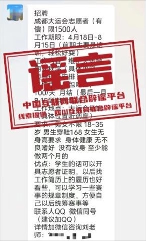 真相:近日,在部分微信群及網(wǎng)絡(luò)平臺出現(xiàn)“成都大運會志愿者招募需求”的信息,并提及“按月發(fā)放補貼”等,引發(fā)不少網(wǎng)民質(zhì)疑。針對網(wǎng)傳信息,成都第31屆世界大學(xué)生夏季運動會官方網(wǎng)站發(fā)布公告稱,成都大運會志愿者招募工作由成都大運會執(zhí)委會人力資源部(志愿者部)負責,目前賽會志愿者招募已結(jié)束,城市志愿者招募正在進行。其它任何企業(yè)、組織或個人以招募成都大運會賽會志愿者或城市志愿者的名義發(fā)布的招募活動信息均為虛假信息。請各界人士避免上當受騙,如因此受到損失和不法侵害,請立即報警,通過法律途徑解決。成都大運會賽會志愿者和城市志愿者招募過程中不會向志愿者收取報名費、培訓(xùn)費、交通費等任何費用,服務(wù)期間不發(fā)放工資。成都大運會執(zhí)委會保留對涉嫌違法違規(guī)的企業(yè)、組織或個人進一步追究法律責任的權(quán)利。(來源:成都網(wǎng)絡(luò)辟謠)